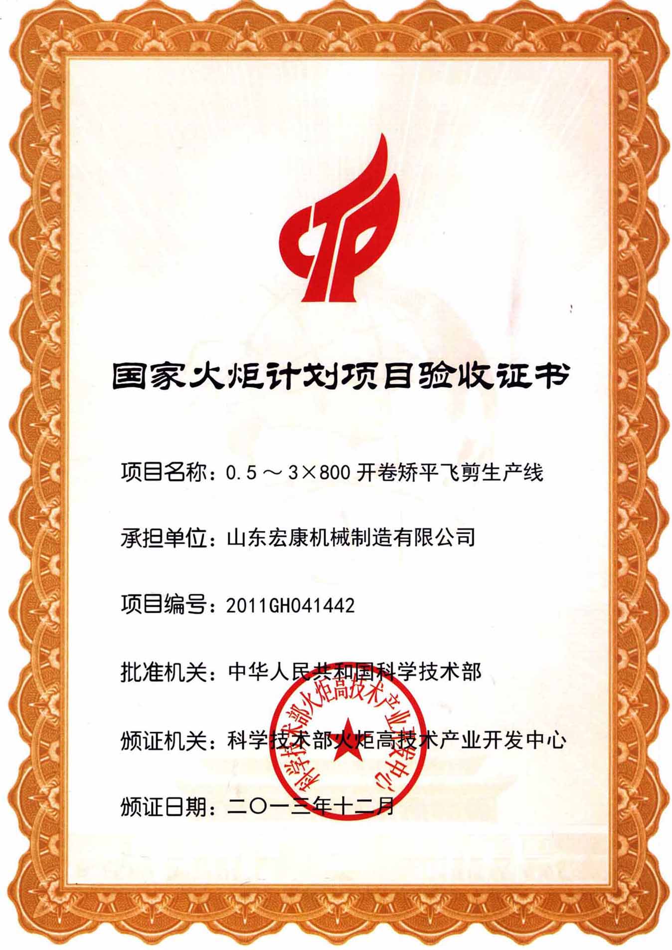 國家火炬計劃項目驗收證書